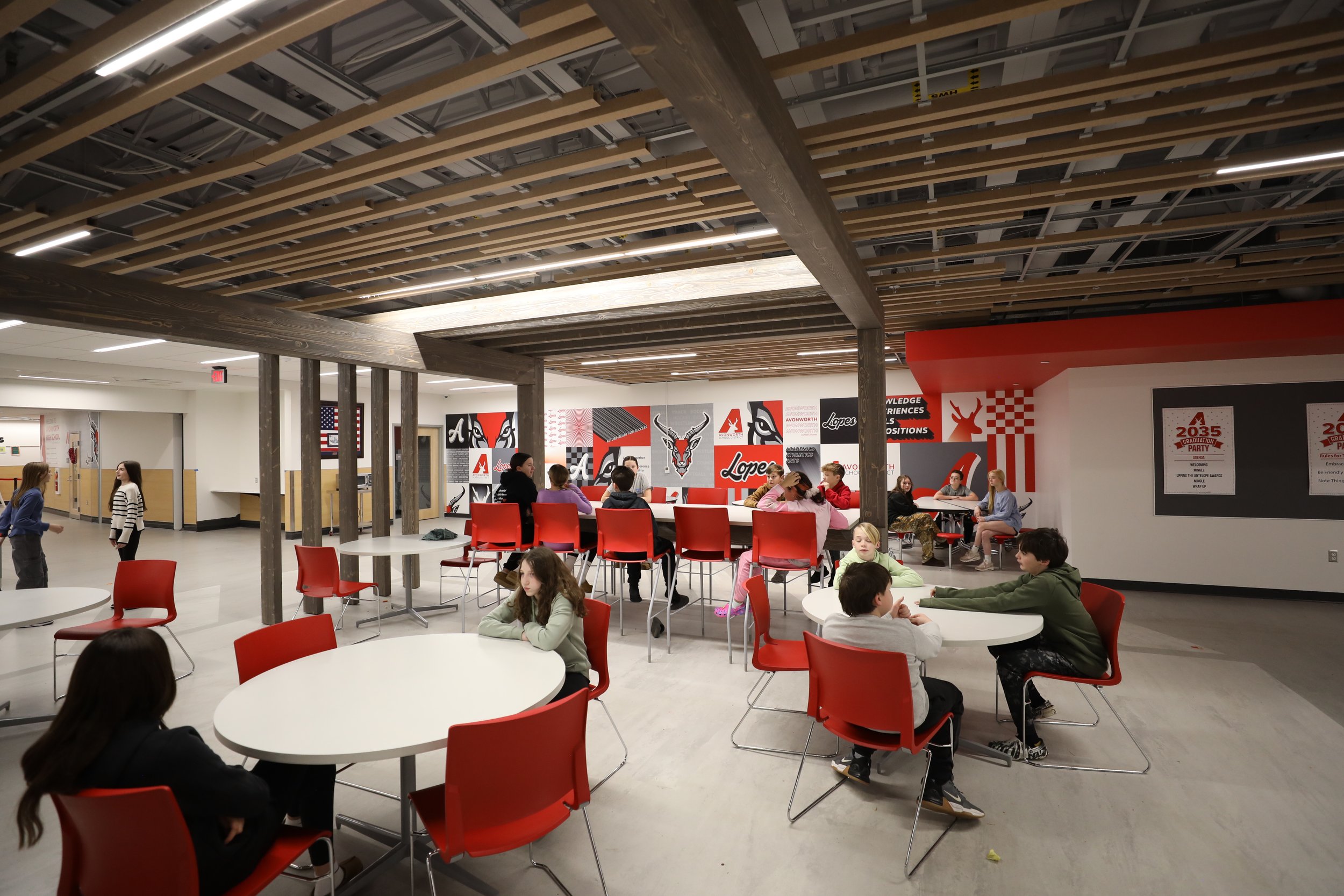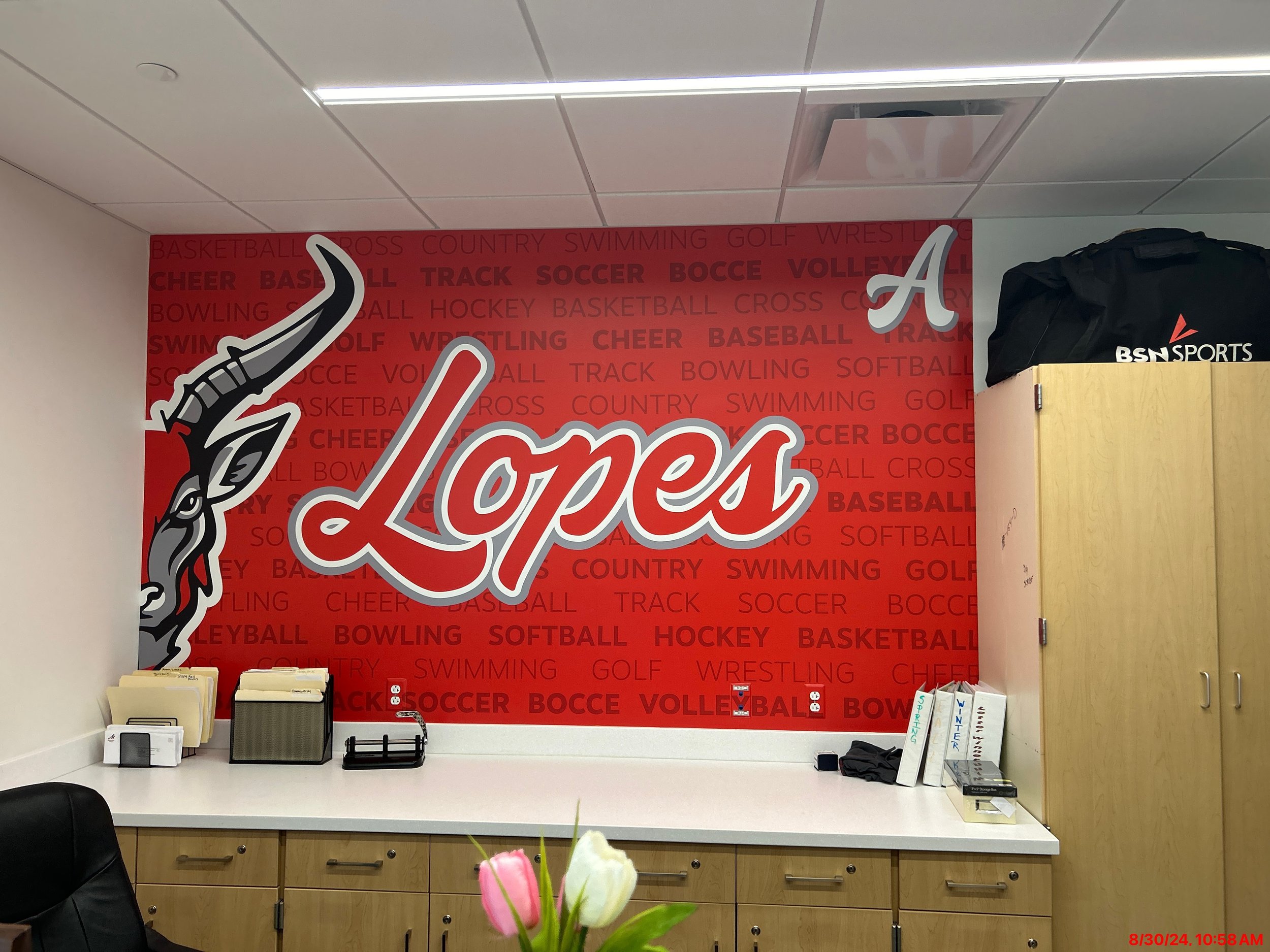 The scope included a wraparound welcome graphic at the main entrance, a “Lopes” pride-themed mural in the student commons, room signage, a compass graphic featuring the district’s core pillars, and an athletics-themed wall in the athletic director’s office.