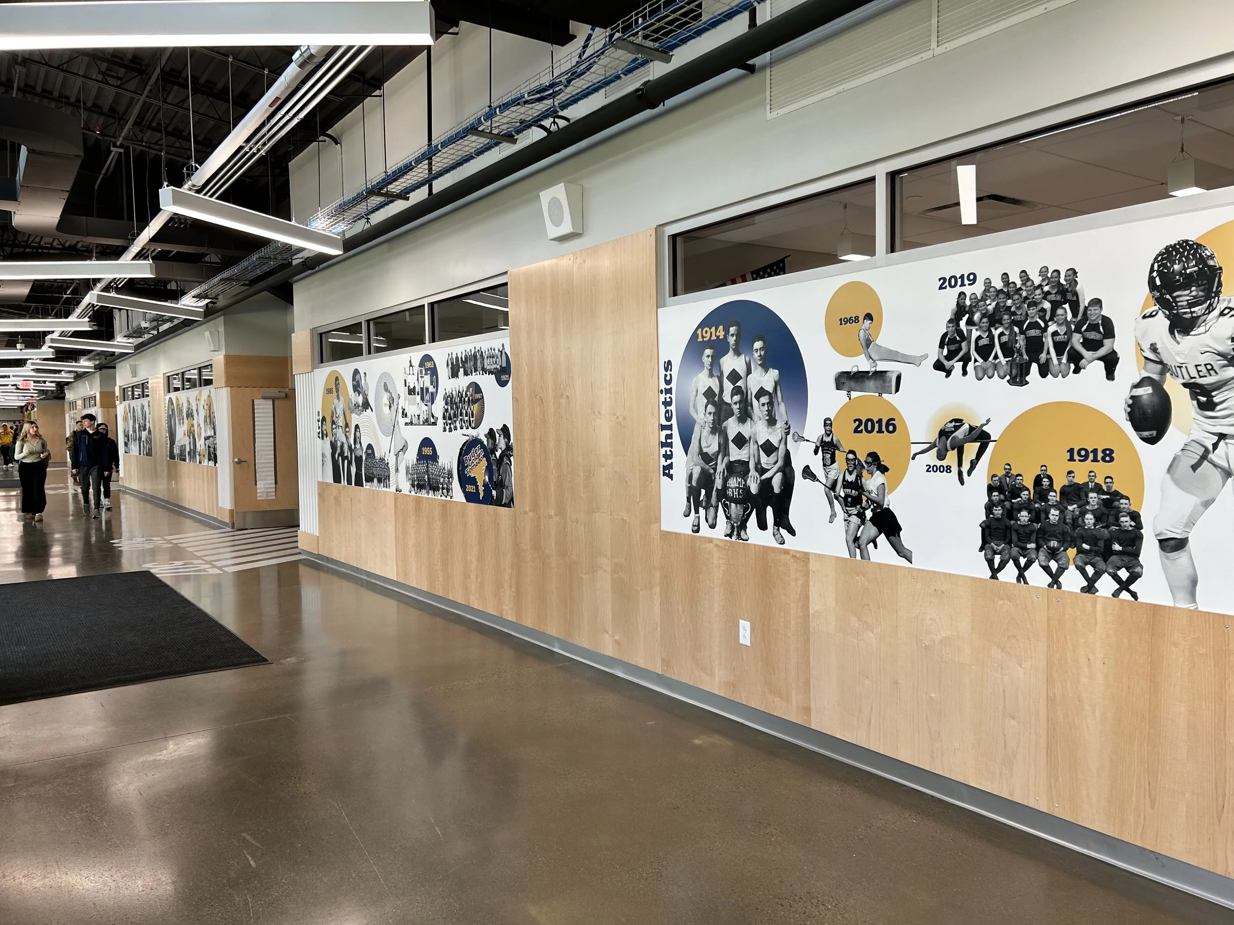 As a 100+ year-old school district, Butler partnered with IKM Architecture on a major addition and renovation of their senior high school campus. The superintendent wanted the school’s rich history represented in a fresh, engaging way through a dedicated history wall as part of the new design.