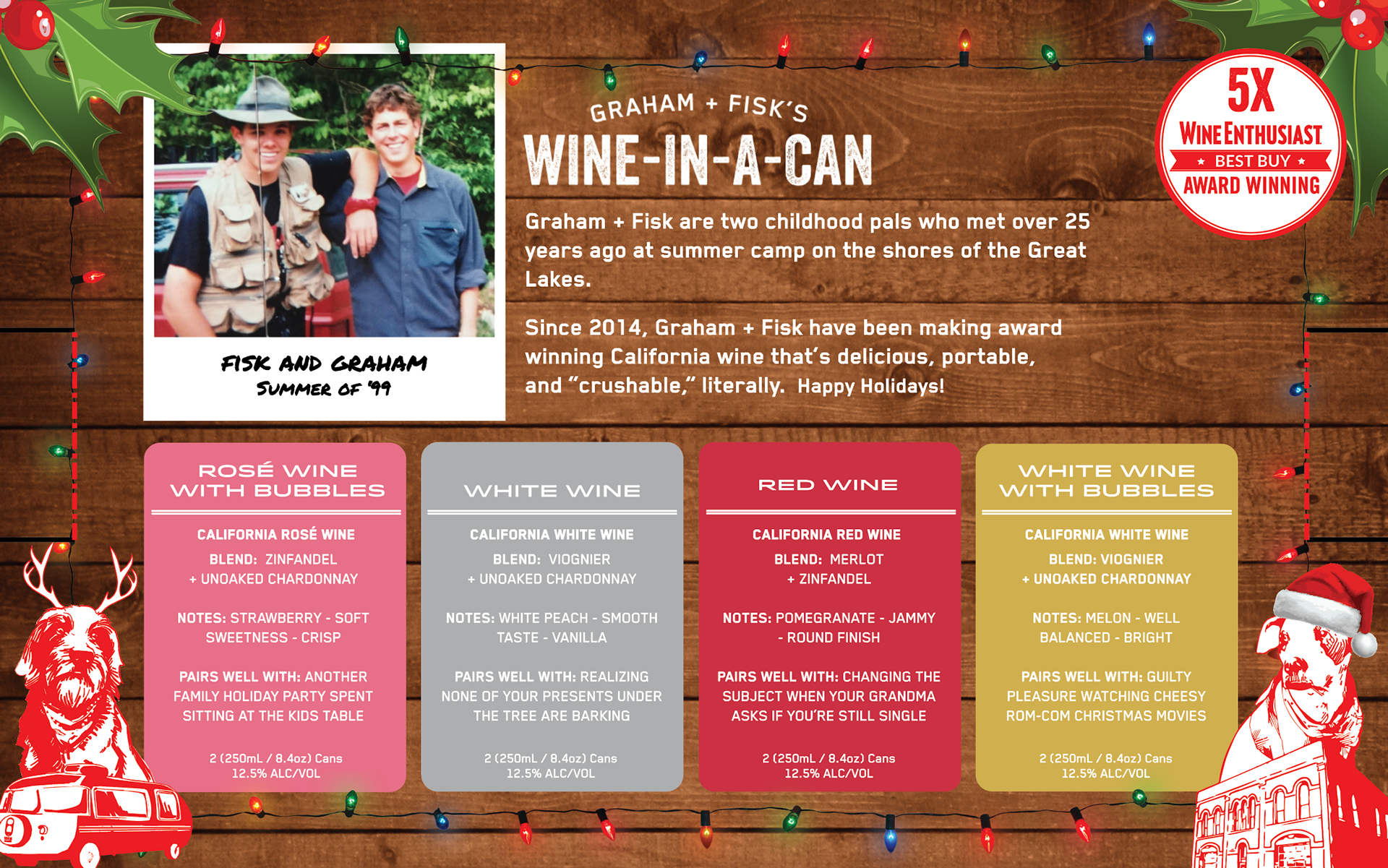 As the in-house Graphic Designer and Marketing Manager for Graham + Fisk’s Wine-In-A-Can (G+F’s), I was responsible for creating seasonal packaging and campaign materials that supported the brand’s marketing calendar and strategic goals. Each seasonal offering helped drive direct-to-consumer sales, deepen customer engagement, and provide fresh content for influencer marketing and social media campaigns. These limited-edition packs served not only as functional packaging but also as tactile brand experiences, emphasizing humor, nostalgia, and seasonality while staying true to G+F’s casual and playful personality.