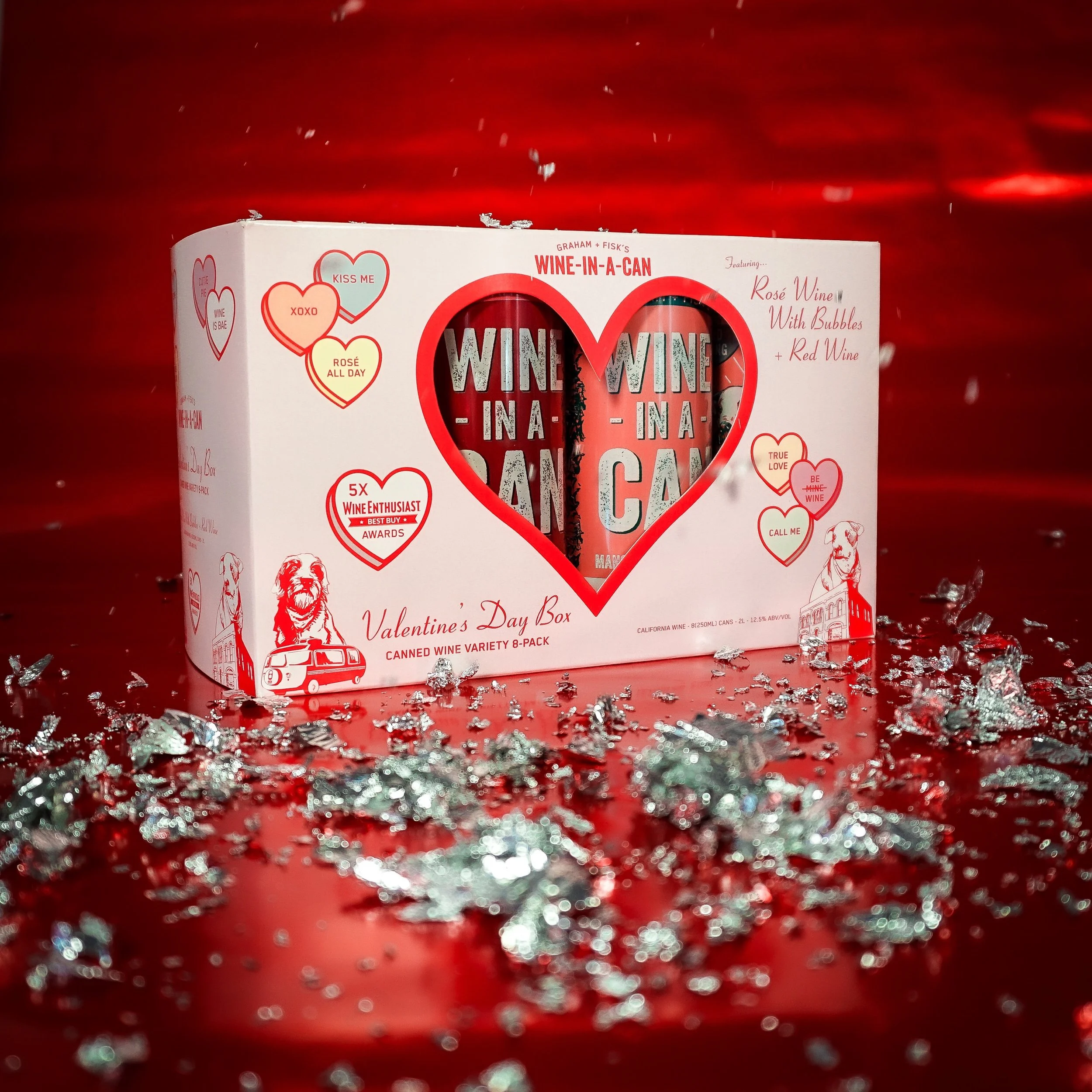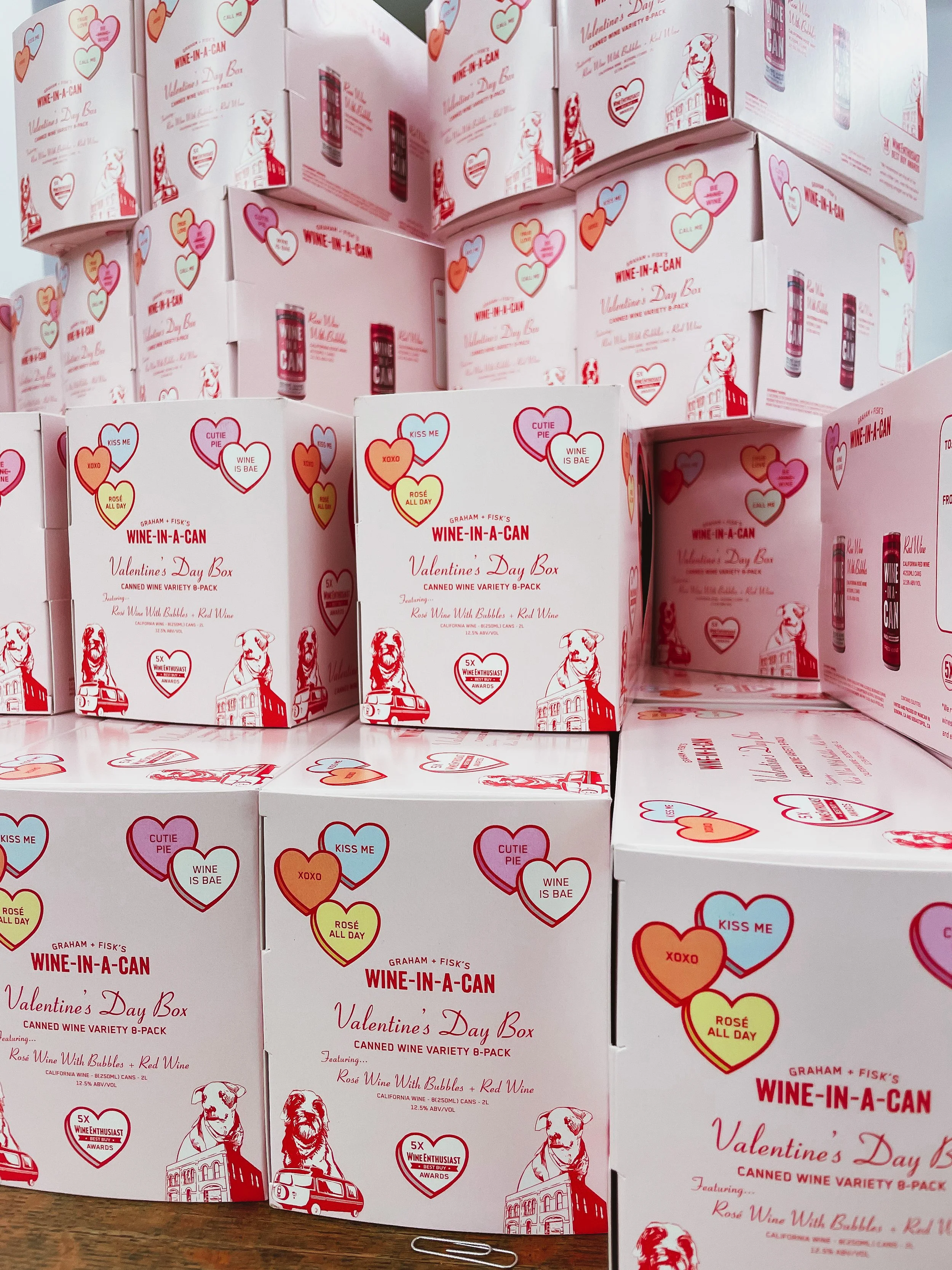 For this seasonal release, I created a playful, nostalgic Valentine’s Day 8-pack featuring a mix of Red Wine and Rosé with Bubbles. The packaging was inspired by vintage aesthetics, drawing visual cues from “I Love Lucy” title scripts and Wes Anderson’s Grand Budapest Hotel, complete with a heart-shaped cutout window that revealed the metallic cans inside.