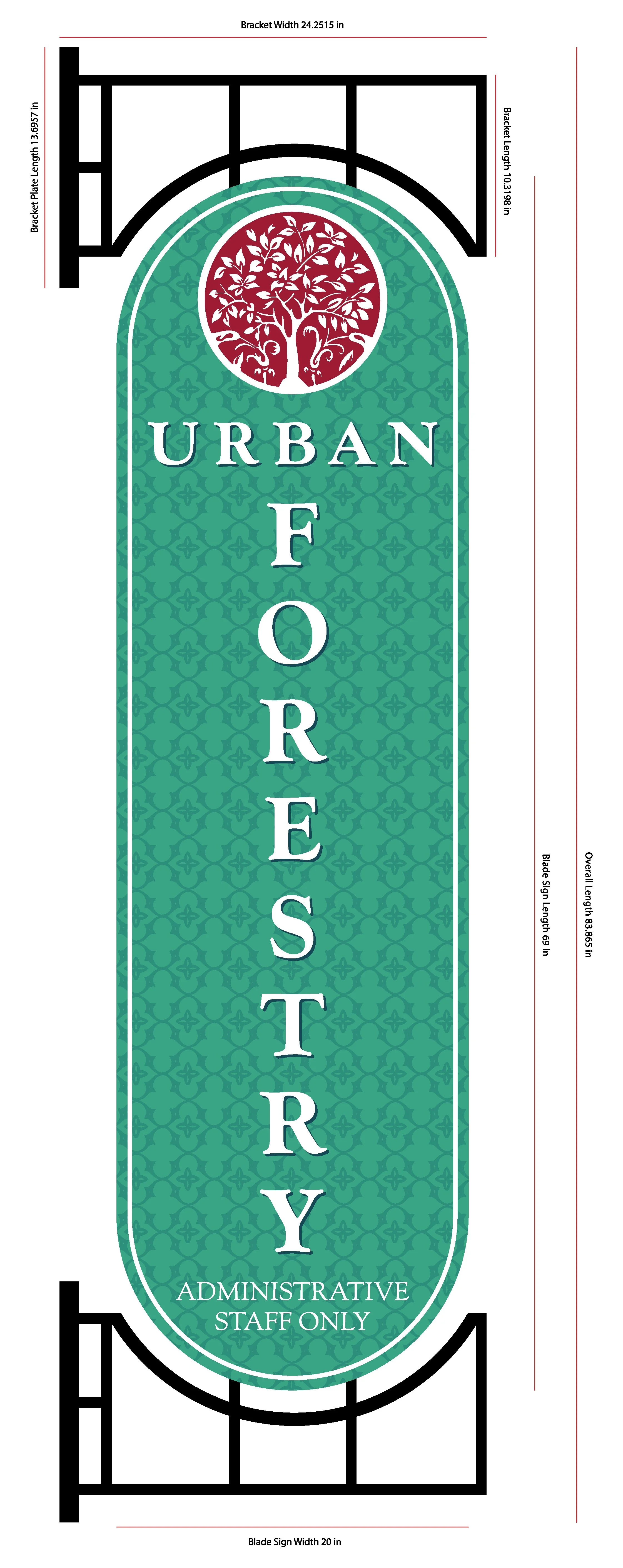 I presented blade sign concepts inspired by existing styles. The Admin Office chose a design featuring a perforated Tree of Life cutout, while Urban Forestry selected a bold vertical sign with matching brackets. I collaborated with a local fabricator to ensure feasibility and prep files for production. The project’s success led to an expanded site-wide signage scope.